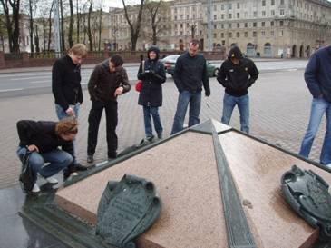 Далее доехали до станции метро Октябрьская (по-белорусски, Кастрычницкая – что очень понравилось гостям :). Там пофоткались с некоторыми памятниками столицы: